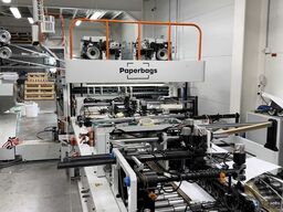 FANBANG- Jianshe máquina de asas de papel trenzado con opción de pliegue Turn top J. Esta máquina está diseñada para fabricar bolsas de papel de fondo cuadrado con asas a partir de papel en hojas, ya sea blanco o impreso. Combinada con una máquina formadora de asas, permite la producción de asas, aplicación de asas, doblado de la boca de la bolsa, encolado lateral, formación de tubo, prensado de fondo, encolado de fondo, formado de fondo y recogida final del producto en un proceso totalmente automático. Es un equipo ideal para fabricar bolsas de papel para alimentos, bolsas de compras y otros, y puede producir bolsas de diferentes tamaños. Dentro del rango adecuado de papel, la capacidad de producción puede alcanzar las 60 unidades/minuto o más, aumentando la productividad y la rentabilidad. El diseño totalmente carenado garantiza la seguridad del operador.